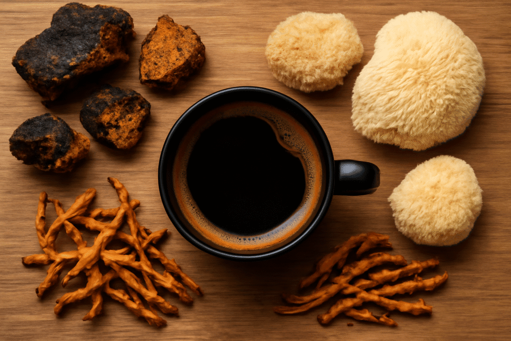 Mushroom coffee is a mix of traditional coffee and medicinal mushrooms like: